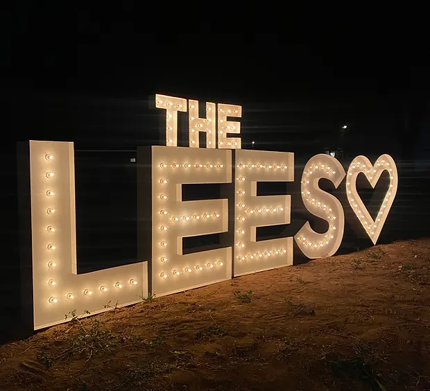 Outdoor weddings are a favorite across Iowa, and marquee letters for outdoor weddings add an elegant glow that enhances natural surroundings. Popular displays include last names, “LOVE,” “MR&MRS,” and custom initials, all of which photograph beautifully against open skies and greenery.
